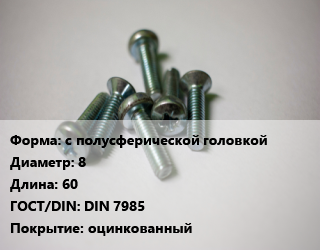 Винт с полусферической головкой 8х60 DIN 7985 оцинкованный, цена за 1000 шт,цена за шт, кг цена от 5.45 ₽ / кг, где купить, условия доставки в Саратове и Саратовской области