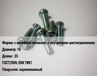 Винт с потайной головкой, с внутренним шестигранником 16х35 DIN 7991 оцинкованный