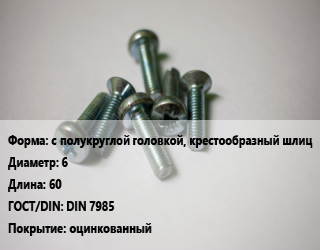 Винт с полукруглой головкой, крестообразный шлиц 6х60 DIN 7985 оцинкованный, кг цена от 4.19 ₽ / кг, где купить, условия доставки в Саратове и Саратовской области